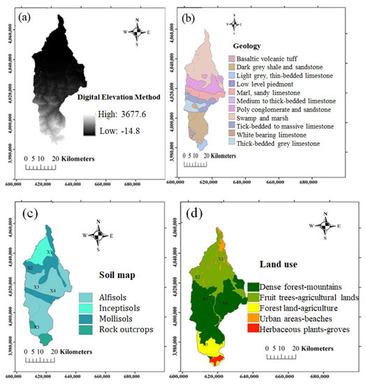 Estimating the amount of sediment yield from a watershed requires various information such as topography, geology, soil, land use, rainfall, land slope, and temperature of the area. Figure 2a shows the digital elevation map of the Babolroud watershed. The southern part of the watershed is mainly occupied by mountains, but there are plain areas with low elevations in the northern part of the watershed. Figure 2b shows the geological map of the study area. There are a lot of alluvial formations in the northern region, and there is a layer of hard and shallow rocks in the southern part. A large part of the watershed has Alfisol soil, as shown in Figure 2c. This type of soil is often observed in humid and semi-humid areas with the presence of forest. Figure 2d shows the land use map of the Babolroud watershed. One can see from this figure that the watershed is covered by dense forest and mountainous areas, orchards, forest–agricultural areas, and groves. Areas with dense vegetation, which covers a major part of the watershed, play a key role in preventing this watershed from the soil erosion process.