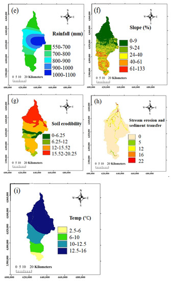 MFI is the modified Fournier index, Pi is the average monthly rainfall depth, and P is the average annual rainfall depth at the “i” meteorological station. This index shows the sum of the weighted monthly rainfall depth at the “i” station. By means of this technique, the daily rainfall data are converted to monthly rainfall for the purpose of developing a raster rainfall map. The average annual precipitation depth in this watershed ranges from 500 to 1100 mm, as shown in Figure 2e. The maximum precipitation depth occurs in the east part of the watershed and gradually decreases towards the north and south of the watershed. As shown in Figure 2f, the highest slope of the watershed appears in the southern part of the basin due to its mountainous landscape, and the lowest slope in the northern part of the basin where a lot of flat plains appear. Additionally, based on temperature data collected during the period from 2008 to 2018, the temperature map of this watershed was developed. As shown in Figure 2i, in the northern part of the watershed, higher temperatures are observed, as the elevation is lower, and in the southern part of the watershed, lower temperatures are observed, as the elevation is higher. The sources and types of each influential factor are presented in Table 5.