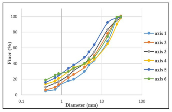 All data were collected during the early spring since the maximum sediment transport occurs during the spring season with high flow. At each cross-section, the channel width (from the left bank to the right bank) was divided into equal spacing intervals of one meter. By applying Wolman’s method, the median grain size of both surface and subsurface layers in the channel bed was more than 10 mm. Flow depth, flow velocity, bed slope, and bed load transport rate were determined at each cross-section. The flow velocity was measured using a current meter (BFMS-N-002-1678) with an impeller diameter of 40 mm. At each point, flow velocity was measured 3 times, and the average value of these 3 measurements was used to represent the flow velocity at this point. Along each vertical line from the channel bed to the water surface, there were about 12 points for velocity measurements. Based on measured results, the velocity profile along this vertical line was developed. In this study, a Helly–Smith sampler was used for measuring the bed load sediment. This sampler was placed on the channel bed. After a period of 60 s, particles that were larger than the mesh size were collected in a bag. Then, all samples collected were taken to the laboratory, and grain size was obtained for each cross-section. In this study, to conduct the bed load sampling measurements, the flow cross-section was divided into 4 to 5 equal subsections. In each subsection, bed load sampling measurements were carried out and repeated 8 to 10 times at each point. The bed load samples collected at each point were analyzed. The grain size distribution of the bed load sediment for one cross-section (K3) is shown as an example in Figure 4.