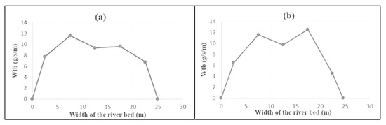 where Qb is the bed load discharge (g/s), L is the length between two points (m), and Wtb is the dry weight per unit time and per unit width (g/s/m) and is estimated by the following equation.