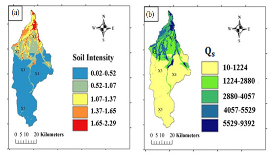 As indicated in Figure 7a, the erosion intensity coefficients in the X1 and X2 sub-basins are very high and high, respectively, due to the presence of plains, orchards, and alluvial soils in the northern area of the watershed. In addition, according to the EPM method, the entire watershed is in the category of the moderate erosion intensity, which indicates that the calculated amount of erosion and sediment yield using this model are more than those using the MPSIAC model.