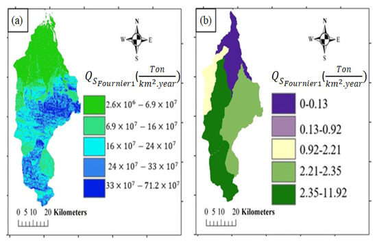 Annual sediment yield based on (a) the first Fournier method and (b) the second Fournier method.