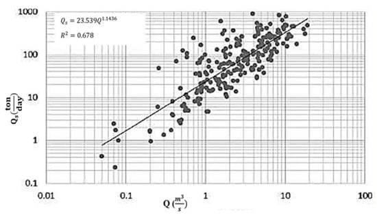 Suspended sediment concentration samples at these stations in this river were collected several times a year, including a data set for the period from 2008 to 2018. With this data set, the sediment rating curve can be plotted (Figure 9). Similar to the results of other researchers [34,35,36], a regression analysis was performed to obtain a power function between suspended sediment discharge (QS) and water discharge (Q) as follows: