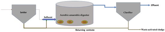 Brewery wastewater composite samples were collected from the influent stream (Figure 1) of a local South African brewery wastewater treatment plant. Wastewater from breweries is first sent to settling tanks where physical separation of solids takes place by gravity prior being sent to the brewery wastewater treatment plant. Effluent from the settling tanks is then sent to an aerobic–anaerobic digester as influent stream (Figure 1) to the brewery wastewater treatment plant. In the digester, biodegradation of pollutants in brewery wastewater occurs. The aerobic–anaerobic digester effluent is sent to a clarifier, where the supernatant leaves as the treatment plant effluent stream did, and is sent to the local municipality wastewater treatment works for further processing prior being discharged into water-receiving bodies.