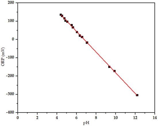 The pH and ORP of the brewery effluent were monitored, respectively, to ascertain the alkalinity and oxidation-reduction reactions [], via the nitrification–denitrification mechanism as well as the phosphorus removal. The ORP versus pH profile presented in Figure 2 clearly shows the synergistic effect of the alkalinity region (>7) and acidic region (<7) of the effluent on the ORP. The ORP decreases with an increase in pH, the trend gave a linear correlation fit constant of R2 = 0.9994, which statistically confirms that there was a significant correlation between pH and ORP. The positive ORP values were attained within the acidic medium (pH < 7), whereas the negative ORP values were observed at pH > 7. This means that wastewater emanated from the brewery was characterized by an ORP ranging between −305 and 135 mV. The fluctuated pH and ORP values can be alluded to the biological activity as well as the effluent composition []. Moreover, the findings of the study on ORP as a function of pH suggest that brewery wastewater can be treated by biological processes on the basis that the reported ORP range permits biological activities as reported from Table 1 [].