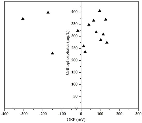Furthermore, it is worth noting that phosphates in an aqueous environment exist as orthophosphate ion on the basis that it is more thermodynamically stable as compared with any other phosphorus ions []. The findings of the study presented in Figure 5 do not explicitly demonstrate any correlation on the recorded ORP values with variation in orthophosphate concentration. Note that relatively high orthophosphate concentrations were recorded despite the significant variation in ORP ranging from −305 to 135 mV. The findings suggest that ORP cannot be effectively used as a real-time brewery wastewater quality monitoring parameter in terms of orthophosphate monitoring.