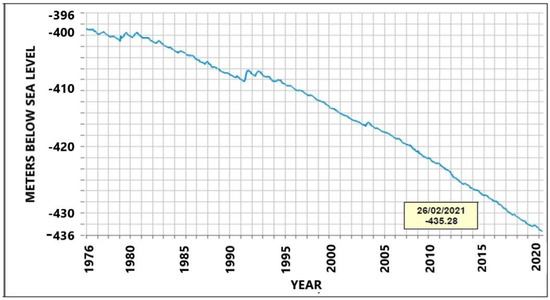 Change in Dead Sea level 1976–2021. Source: adapted from IWA, 2022. https://www.gov.il/he/Departments/General/dead-sea-stats (accessed on 14 January 2022).