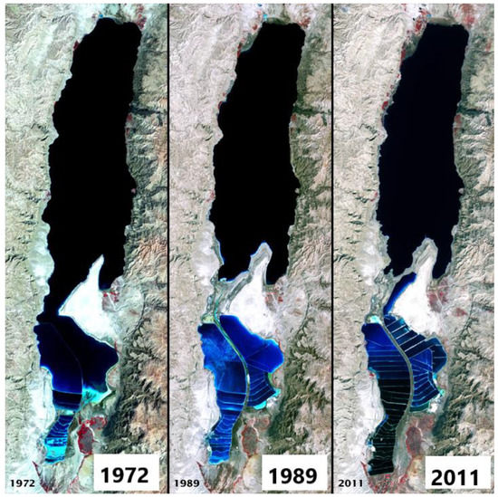 Change in Dead Sea surface area 1972–2011. Source Adapted from (NASA, 2012) https://earthobservatory.nasa.gov/images/77592/the-dead-sea (accessed on 20 April 2021). Note: the distinct color of the southern portion of the basin reflects its transformation from the natural sea to a series of managed evaporation ponds serving mineral extraction industries in Israel and Jordan.