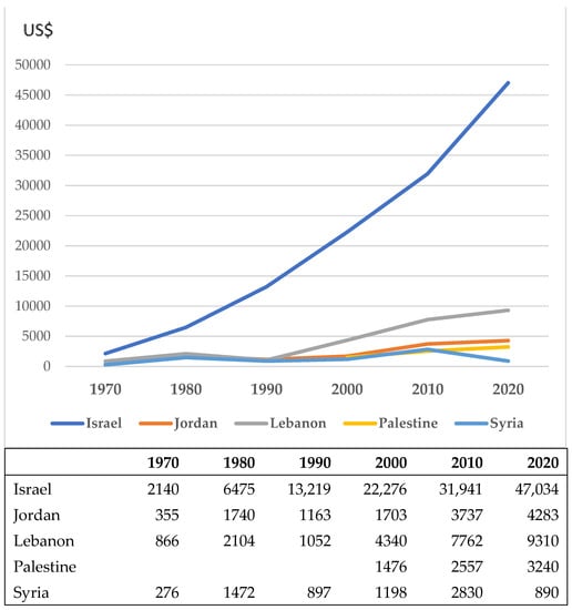 Other strategies, however, were specific to each country’s socio-economic and/or political circumstances, as detailed below. Socio-economic disparities between countries, especially between Israel and its neighbors, were already apparent prior but became more prominent, as can be seen in the differences in their gross domestic product (GDP) per capita over time (Figure 4). These differences in economic capacity translated into differences in finance, building, and maintenance of water infrastructure, policies, and innovation.