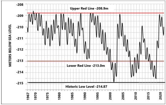 Change in Sea of Galilee level 1967–2022. (Note: Upper red line is the level at which a dam at the southern outlet is to be opened to allow flow into the Lower Jordan River to prevent flooding around the shores of the Sea of Galilee. The Lower red line is an administrative goal below which water levels are not supposed to drop in order not to cause high salinity and risk permanent ecological damage.) Source: adapted from (IWA, 2022). https://www.gov.il/he/Departments/news/news-kinneret (accessed on 14 January 2022).
