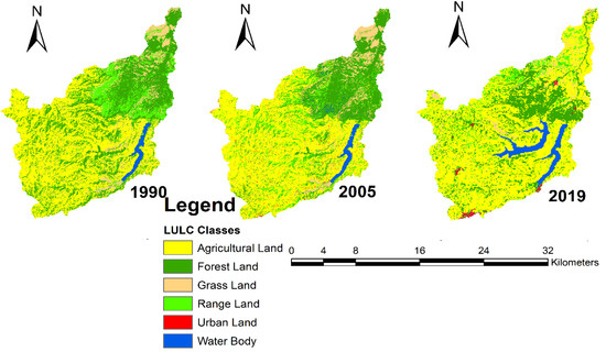 The operation of a reservoir is very challenging for water resource planners and managers; it involves numerous, intricately linked variables, such as storage, power production, hydrological, environmental, institutional, political, as well as the uncertainty of reservoir inflow and stochastic fluctuation of water demands [10,11,12,13]. Historical and future LULC changes will alter the pattern, intensity, and frequency of rainfall events, influencing regional and global stream flows and water resource reliability, which may cause significant challenges for reservoir management [14,15,16,17]. Therefore, changes in LULC have a significant impact on the distribution and timing of water changes, which affect a variety of water resource operations and managements, including the operation rule curves in addition to the capacity of basins to generate hydropower [14,18,19].