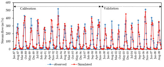Land use land cover change has an impact on stream flow, which is a critical hydrological response used in water resource management planning and environmental assessments [62]. The influences of LULC change on annual, seasonal, and monthly stream flow were investigated with regard to the baseline period of 1990, and to 2005 for the current (2019) and future (2035 and 2050) LULC changes. Multiple land use transitions in the watershed were projected using the Land Change Modeler integrated TerrSet model [14]. The stream flow corresponding to the individual LULC variations was simulated using the SWAT hydrological model. The SWAT model was calibrated and validated from 1987 to 1999, and from 2000 to 2008, respectively, on a monthly basis.