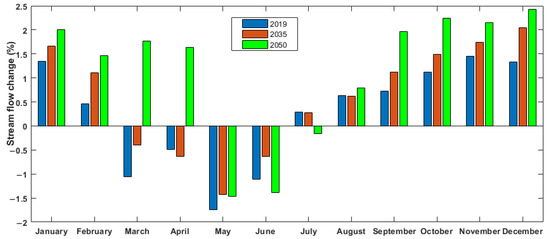 Figure 6 depicts the average monthly percentage change of current and predicted hydropower reservoir inflow patterns under LULC change impacts. The results are in agreement with the results of the study conducted by Sajikumar and Remya [63] on the impact of land use land cover change on inflow characteristics. The average monthly stream flow change shows a maximum increase of 2.43% in 2050, and a maximum decrease of 1.74% in 2019. The trend of monthly stream flow shows that, individually, there was an increasing trend from August to February, and a decreasing tendency from March to July.