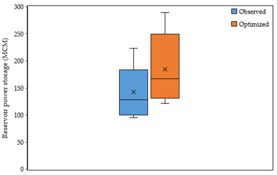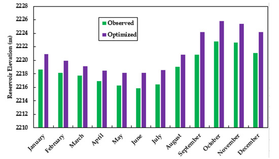 The aim of performance measures is to provide a mechanism to compare the effectiveness of the reservoir system in accomplishing specific objectives quantitatively for different operating plans. In addition to the current reservoir operation, optimization strategies for the sole purpose of hydropower generation are frequently used in the area of water resources management [18]. The average annual optimized reservoir power storage and reservoir pool level increased by 10.58 MCM and 3.12 m, respectively. Figure 9 shows the associated optimal hydropower generation compared to the actual hydropower output. As can be seen, optimized operation performs better. Since the total volume passing the turbines is generally the same in both operation scenarios, the add-on for power supply is mainly generated by an increased storage level, and with that, an increased water head.