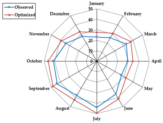 Average monthly current observed and optimized elevation of the Nashe reservoir.