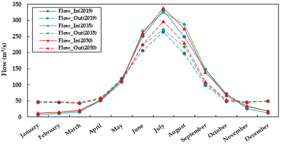 During the season of rain, the water volume flowing into the reservoir is typically at its maximum, making it difficult to control the excessive outflow. Similarly, as depicted in Figure 10, average outflow values were also highest during the wet season, mostly in June, July, August, while decreasing in the other seasons. The high runoff season of the study area begins mostly in June and ends in September. From November to April, it is the only base flow that flows into the reservoir. Similarly, during this time period, the outflow exceeds the inflow. From the results, it was observed that the average maximum monthly reservoir inflow ranges between 320 m3/s and 350 m3/s in 2019, 2035, and 2050.