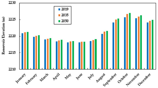 The Nashe hydropower reservoir pool level contains the relationship of the elevation-storage-area curve. The average monthly maximum and minimum reservoir levels for the future vary between 2226.76 m and 2227.01 m, and 2218.34 m and 2218.40 m, respectively, for the 2035 and 2050 LULC change scenarios, respectively. The results of reservoir elevation between operations in 2019, 2035, and 2050 were compared and are illustrated in Figure 12. From the results, it was observed that the optimized pool level is greater than the current optimal reservoir levels of the Nashe hydropower reservoir. This significant elevation difference will allow more water to be stored during the rainy season for energy production during the dry season.