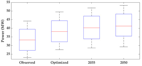 Figure 14 shows the optimal rule curves for the 2035 and 2050 scenarios in comparison to the existing rule curves. The rule curve features are based on the quantity of the inflow, which is ascribed to rainfall patterns and reservoir operation in proportion to monthly energy requirements. The power rule curves of the future scenarios also follow similar tendencies, but are higher compared to current optimized and efficient rule curves, with uneven power distribution from month to month. The 2050 LULC scenario rule curve shows the highest average power storage, reservoir level, power production, and total energy. According to [65,66], the optimal operating rules for reservoirs should be better than the current random operational rules using an optimization algorithm for annual hydropower production.