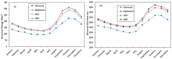 The optimum reservoir storage occurred between September to December, with peak storage in October. The optimized future storage volumes for the reservoir within scenarios are greater than the current actual and optimized reservoir operations. However, most of the average storage volumes are close to the optimized current reservoir storage operation, especially during dry and short rainy seasons. Likewise, the storage volumes for the 2035 LULC scenario’s maximum volume are more comparable to the 2050 future scenario operation. According to [65,66] investigations, the optimum reservoir storage obtained by using the optimization algorithm for the reservoir should be better than the currently used operational storage for optimizing annual hydropower production. Figure 11 illustrates the average monthly reservoir storage results derived by the HEC-ResPRM optimization model for operations in 2019, 2035, and 2050.