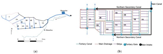The actual layout of the Doho rice scheme (a) and the schematic layout of the Doho rice scheme (b). The strip is the last terminal canal.