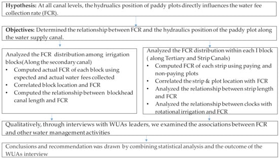 As shown in the research process logical flow in Figure 2, we investigated the relationship of hydraulic position along canals to FCR and, later, as an additional consideration, investigated water management activities through interviews. Quantitatively, by plotting the distribution of FCR for each farmer group at three canal levels and using multiple regressions analysis, we established the relationship between FCR and hydraulic position along the canal. Qualitatively, through interviews with WUAs leaders, we examined the associations between FCR and other water management activities.