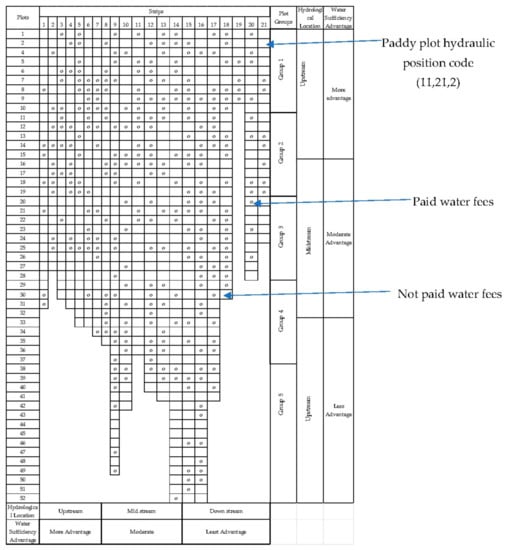 Coupled with other water management activities, sufficient water supply to farmers influences the water fee collection rate [,,,,,,,,], a fact many researchers have confirmed. However, in this context, we inferred that sufficient water supply to the farmer is mainly influenced by the hydraulic position along the water supply canal. Further, other farmers’ water management activities play a role.
