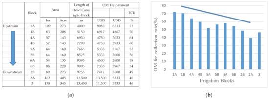 In addition, many other case studies of irrigation management in developing countries have pointed out the problem of low FCR [,,,,,,,]. However, most of them are limited to the issue of low FCR in large irrigation schemes as a whole. There are few research analyses of FCR among and within small irrigation blocks within irrigation schemes. If farmers’ OM payments are related to farmers’ WTP, it should have a lot to do with the availability of adequate water for individual farmers. The FCR of a canal may be lower downstream in the canal at all levels, but few studies have sought actual FCR from such a perspective. In the case of large irrigation schemes, canals are divided like a tree branch, and sub farmers’ organizations are often aligned to the tree branches; it is thus necessary to analyze the FCR distribution of canal levels for effective future improvements.