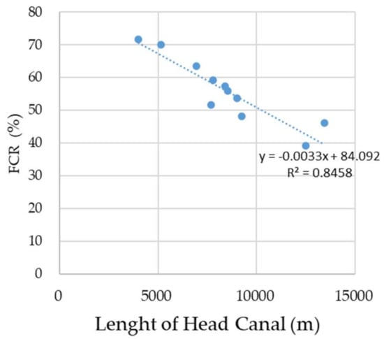 The graphical relationship and simple regression analysis of block FCR with the distance of the head canal from the main headworks were also performed, as shown in Figure 6. At a 95% significance level, there is a positive relationship between FCR and the distance of the head canal. A longer head canal implies more head losses in the head canal as water moves, meaning the length of the head canal reduces the water sufficiency downstream, and hence there is lower FCR downstream.