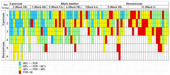 As shown in Figure 7, the results of variations of FCR within the surveyed blocks are presented. There is a general decrease in FCR downstream of the tertiary and strip canals. This is evident by the increase in the intensity of the block group of FCR < 40 and 40 < FCR < 60 in the downstream areas at all canal levels.