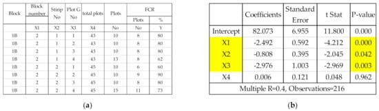 The dependent variable Y is FCR, and the independent variables (x1–xn) include block position, strip number, and plot group numbers.