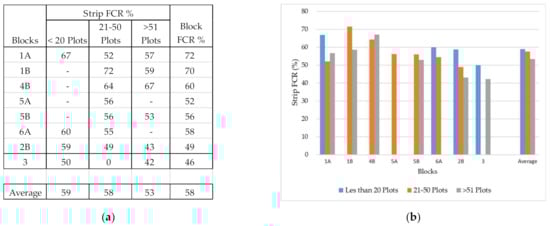 The analysis of the impacts of strip length on FCR is summarized in Figure 9a and graphically plotted in Figure 9b. The average fee collection rate increases with a decrease in the total number of plots along a particular strip in all the blocks.