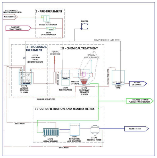 The WWTP with nine steps: 1-grid and sandbox for solid residues reduction; 2-oil and grease retention box to reduce the effect of these fats on the development of the microbial community; 3-aerobic reactors for carbonaceous organic matter degradation; 4-denitrification of organic matter and releasing of N2; 5-flocculation of residual salts; 6-decanting for removing the sludge from the treated water, 7-disinfection to remove pathogens; 8-ultrafiltration; 9-filtration by zeolites for retention of colloidal particles.