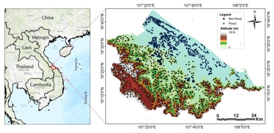 Due to the number of people affected, globally floods have the most significant impact of all natural hazards each year. They represent more than half of the world’s catastrophic events [,,]. According to the EM-DAT database, from 2000 to 2018 more than 2900 floods were recorded, causing more than 295,000 deaths, affecting more than 1.5 billion people, and causing overall economic losses of nearly 503 billion USD. Asia is the region most affected by flooding, causing significant damage to the economy and human life [,,,,]. During 1900–2016, countries in the region were affected by 3620 floods and typhoons, resulting in over 683 billion USD of damage []. Due to its geographic location and dense hydrological network, Vietnam is considered to be one of the countries most affected by flooding []. It has been ranked among the eight countries most affected by extreme weather conditions. For example, the 1999 flood caused a loss to the economy of over USD 300 million, 547 deaths, and over 630,000 houses damaged []. Therefore, it is necessary to develop an appropriate strategy to reduce this considerable impact on people’s livelihoods and wider socio-economic activities.
