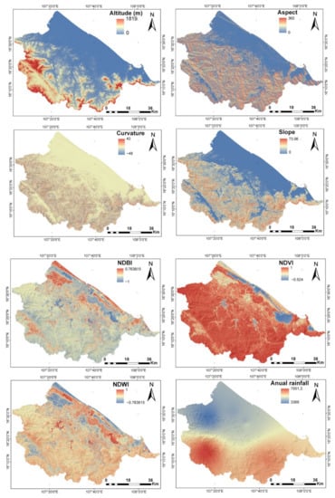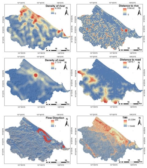 The selection of conditioning factors is considered an important task; scientifically selected factors will greatly improve the accuracy of a flood susceptibility model. These factors are divided into environmental, hydrological, climatic, and human activities [,]. In this study, 14 conditioning factors were selected, namely elevation, aspect, curvature, slope, density of river, density of road, distance to river, distance to road, flow direction, Topographic Wetness Index (TWI), Normalized Difference Vegetation Index (NDVI), Normalized Difference Built-up Index (NDBI), Normalized Difference Water Index (NDWI), and rainfall (Figure 2).