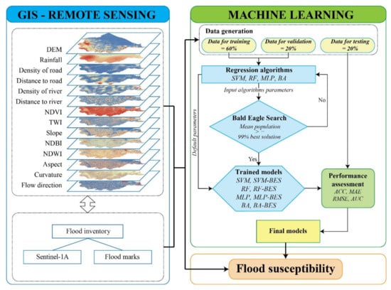 To accommodate these limitations, the global scientific community has integrated spatial analysis and data-driven models to identify large regions of flood susceptibility with high precision, even for regions with limited data. Previous studies have used traditional models, including bivariate statistical models [], frequency ratio [], weights-of-evidence [], and fuzzy weight of evidence []. However, these models are mainly linear structures and fail to address the complex and non-linear structure of flooding events. Currently, there is a new trend of employing artificial intelligence in combination with remote sensing and GIS to better visualize and assess the effects of flooding, such as support vector machine (SVM) [,], artificial neural networks (ANN) [], Kernel Logistic Regression (KLR) [,], decision trees (DT) [,], Random Forest (RF) [,], Adaboost (ADB) [,], and Bagging [,]. These have several advantages over traditional models: (i) They can predict complex non-linear structures of flood events with high accuracy, even in data-bound regions and (ii) they can easily combine with spatial data obtained from satellite images. However, the flood susceptibility model encounters several obstacles, such as selecting the best modeling methods from a wide range, and each approach has obtained different results. In addition, each approach for predicting flood susceptibility has several disadvantages []. Therefore, the search for new optimization algorithms to improve the ability of prediction is necessary because hybrid models limit the weak points of individual models by combining two or more models []. Various optimization algorithms have been developed in the literature, divided into two groups: Evolutionary Algorithms (EA) and Swarm intelligence (SI). EA is an intelligent computing technique applied widely to solve several problems such as combinatorial and non-linear optimization []. This technique can easily solve different problems by integrating previous information into the evolutionary research process to effectively exploit a state space of possible solutions []. SI solves the problem by simulating animal behaviors, including exploration and exploitation []. SI has the advantage in solving computational and combinatorial problems thanks to its ability to find the best position in the swarm []. However, the global issue of optimization and preservation of optimization until the end of the research is seen as one of the essential challenges in solving several problems []. There is no universal guide for selecting the best method for flood susceptibility. Therefore, it is necessary to exploit novel algorithms to complete these gaps. This study proposes a new nature-inspired technique which combines the advantages of SI and EA, namely Bald Eagle Search (BES), which simulates the behavior of bald eagles when searching for food. This process is carried out in three processes: first, bald eagles identify an area within which to search for food; second, they search for food in that area; third, they attack their prey [,]. The algorithm is widely applied in various fields such as ecology, energy, and economics; however, according to the best understanding of the authors, it has not yet been explored in the field of earth sciences to predict flood susceptibility prediction.