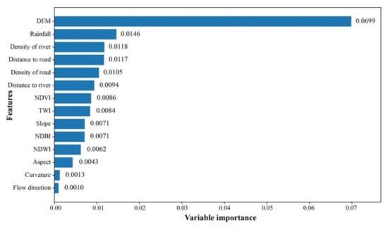The Random Forest model was used to hierarchize the 14 conditioning factors considered in this study (Figure 4). Based on Random Forest, the VI index was calculated for each conditioning factor and these factors were ranked from 1 to 14. The results show that all factors contributed to the flood prediction. Among them, DEM (0.0699), rainfall (0.0146), density of river (0.0118), and distance to road (0.0117) are more influential on the spatial modeling of flood susceptibility compared to other factors. Then, density of road (0.0105), distance to river (0.0094), NDVI (0.0086), TWI (0.0084), slope (0.0071), and NDBI (0.0071) are classified from fifth to tenth. The other four factors: NDWI (0.0062), aspect (0.0043), curvature (0.0013), and flow direction (0.001) have the least effect on the flood susceptibility model.