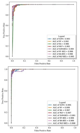 The flood susceptibility models were trained with the same training data and evaluated using the same validating data and testing data. Figure 5 shows the ROC curve of eight prediction models, namely SVM, RF, BA, MLP, SVL-BES, RF-BES, BA-BES, and MLP-BES. Among them, the RF-BES and BA-BES modes were more efficient with AUC = 0.998. The MLP-BES model was second with AUC = 0.995. The SVM-BES model was third with AUC = 0.994. The MLP, and SVM models were fourth with AUC = 0.993. The remaining two models, RF and BA, performed less well than the other models, with AUC = 0.992 and 0.986, respectively. The three models RF-BES, BA-BES, and RF—with AUC = 0.999 were most efficient for testing data. Next were the MLP-BES with AUC = 0.998, BA and MLP with AUC = 0.997, and SVM with AUC = 0.995. Finally, the SVM-BES model was least efficient, with AUC = 0.991.