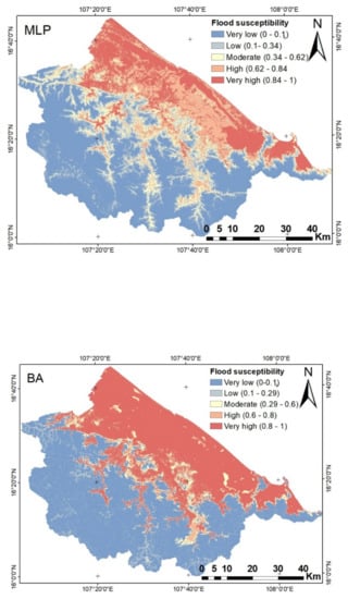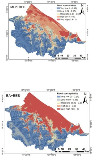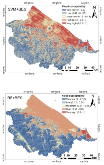 Figure 6 shows the susceptibility map constructed by the model SVM, RF, BA, MLP, SVM-BES, RF-BES, BA-BES, and MLP-BES. The distribution of each class with the different models is presented in Table 3. Although there are performance differences between models, all models showed that most high and very high flooding occurs on the coastal plain and in low areas along the river. Among them, for the SVM model, 28.57% of the study area was located in areas with high and very high flood susceptibility; this figure was 39.13% for the RF model, 41.93% for BA, 33.42% for MLP, 32.84% for SVM -BES, 31.55% for RF-BES, 39.41% for BA-BES, and 33.17% for MLP-BES.