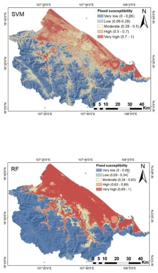 Distance to river and density of river are the critical factors influencing the probability of flood occurrence because they control the propagation and intensity of the flooding. If the distance to the river is short, the probability of flooding will be high. Regions where the density of the river is higher are more susceptible to flooding [,,].