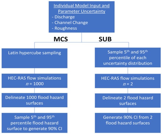 Sources of uncertainty in model estimates of flood hazards are numerous and well documented [9,10]. Monte Carlo simulation (MCS) is a useful tool to estimate uncertainty in flood hazard estimates, but this methodology has primarily been limited to a single research setting. Alternative methods to approximate uncertainty, such as first order approximation, require knowledge of derived response functions that are difficult to determine for complex hydraulic models. A cost-effective alternative to quantify uncertainty in flood hazards estimates from hydraulic models could be a valuable tool in floodplain management.