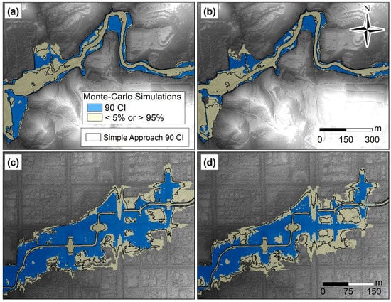 90% confidence intervals (CI) of flood inundation estimated by MCS and the SUB for (a) the 1% AEP flood at Proctor Creek, (b) the 2% AEP flood at Proctor Creek, (c) the 1% AEP probability flood at Bronx Wash, and (d) the 2% AEP flood at Bronx Wash. The 90% CI indicate areas that have a 5–95% chance of being inundated by the flood with a specific AEP.