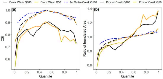 The CSI and percentage of inundated area indicate that SUB simulates the mean condition with high accuracy, but performance declines with increasing distance from the mean (Figure 4). Performance appeared to be worse at the lowest quantiles (less than 0.05). Despite this relationship, the CSI was greater than 80% for all quantiles exceeding 0.1 at Proctor Creek and greater than 70% for all quantiles exceeding 0.05 at Bronx Wash. Lower quantiles resulted in an underestimation of inundated area, and higher quantiles resulted in an overestimation of inundated area. This general error pattern overestimates the uncertainty quantified by MCS, supporting observations in Figure 3.