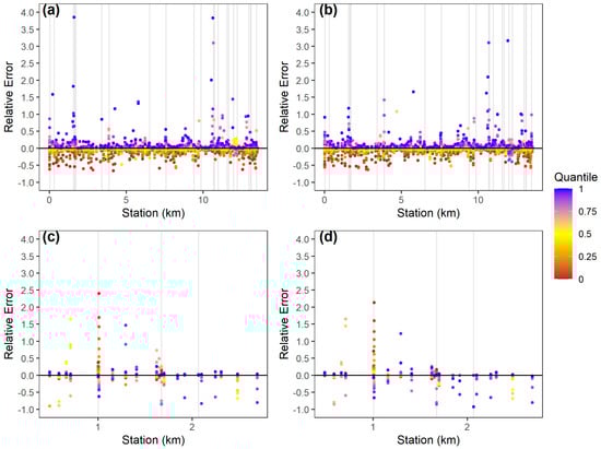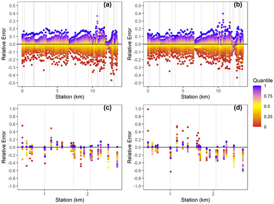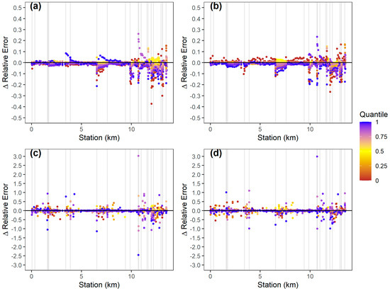 Hydraulic structures had a heterogeneous impact on relative error at Proctor Creek (Figure 8). Negative values in Figure 8 indicated instances where structures reduced error, and positive values indicate instances where structures increased error in SUB. The impact of structures varied among quantiles, flow magnitudes, and stations. However, it is important to note that the impact of hydraulic structures on the accuracy of SUB propagated upstream and downstream, but the impact diminished with increasing distance from the structure. Structures tended to increase the relative depth error for lower quantiles of the 2% AEP flood at Proctor Creek and decreased error for higher quantiles. Thresholds might exist at structures or topographic transitions where hydraulic conditions change rapidly with increasing/decreasing water levels. For instance, a bridge may reduce errors by constricting flow and partially controlling the maximum flow rate on the downstream side of the bridge once water levels reach the bottom of the bridge deck but before overtopping occurs. However, the impact of hydraulic structures on the accuracy of SUB was neither negligible nor straightforward.