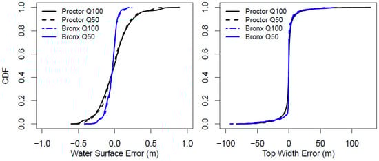 For comparison, we included the results of Stephens and Bledsoe [3] at McMullen Creek, Charlotte, NC. Performance was improved at Proctor Creek and McMullen Creek compared to Bronx Wash, which is likely due in part to the reduced variance in model input and parameter uncertainty compared to Bronx Wash. In general, performance among flood frequencies at each reach was similar with the exception of a minor deviation around the 0.8–0.95 quantile at Bronx Wash. This result contrasts the spatial variation observed in Figure 3, suggesting that spatial patterns in error shift with discharge so that performance is similar among flood magnitudes; however, spatial variation in performance occurs due to variations in local channel and floodplain characteristics that propagate uncertainty differently.