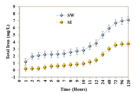 Figure 2 presents the observed iron concentration results resulting from SW and SI materials dissolution by 2 mM 1, 10 Phenanthroline. The results indicate that the observed iron concentrations increase with time and continuously increase even after 120 h of experimental operation. However, a linear increase was observed within 24 h of experimental operation. Similar observations were reported elsewhere []. The results indicate that higher iron concentration (7.11 mg-Fe/L) was attained with SW materials than that (3.7 mg-Fe/L) with SI materials within 120 h of experiment operation. Based on the procedures for specifying the Fe0 materials’ reactivity as adopted from Lufingo, Ndé-Tchoupé [], the following results were obtained: (i) the identified linear (R2 = 0.9786 for SI and R2 = 0.9612 for SW) timeframe was between 2nd to 10th hour (Figure 2) (ii) the rate of dissolution (Kphen) for SI and SW materials were 4.41 µg/h and 5.05 µg/h, respectively (iii), amount of FeCPs (mg/L) on Fe0 materials or the fraction thereof that is dissolved by 1, 10 Phenanthroline, b for SI and SW were 5.23 µg and 91.36 µg, respectively. Therefore, SW materials have a higher dissolution rate and are more reactive than SI materials. It is expected that SW will perform better than SI materials in the pollutants removal mechanisms that mainly depend on the reactivity of Fe0 materials. However, too reactive Fe0 materials (e.g., nano scaled Fe0) have been linked with impairment of microbial degradation of pollutants, while lower reactive Fe0 materials (e.g., micro-scaled Fe0) with longer-lasting in anaerobic digestion, and slower release of the H2 that support microbial respiration [].