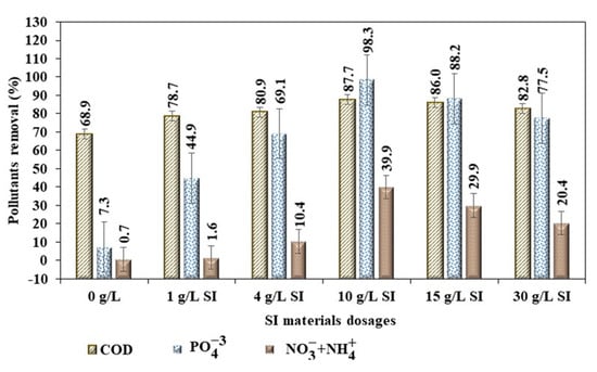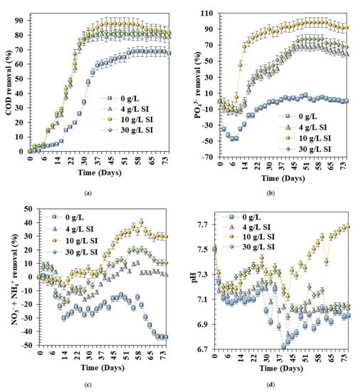 Comparison of the effects of varying SI materials dosages in pollutants removal efficiency. (a) COD removal; (b) PO43− removal; (c) NO3− + NH4+ removal; (d) pH variations. SI materials’ dosages were 0 g, 4g/L, 10 g/L, 15 g/L and 30 g/L; Systems’ temperature, T = 37 ± 0.5 °C.