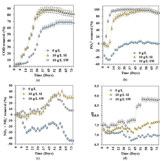 Comparison between SI and SW materials’ effect on pollutants removal (a) COD removal; (b) PO43− removal; (c) NO3− + NH4+ removal; (d) pH variations. Fe0 materials’ dosages were 0 g, 10 g/L SI, and 10 g/L SW; Systems’ temperature, T = 37 ± 0.5 °C.
