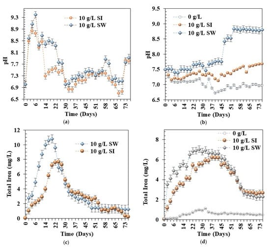 pH and total iron concentration variations resulting from 10 g/L of Fe0 materials (SW or SI) dosage in distilled water or domestic sewage. (a,c) Fe0 materials in distilled water; (b,d) Fe0 materials in domestic sewage. Systems’ temperature, T = 37 ± 0.5 °C.