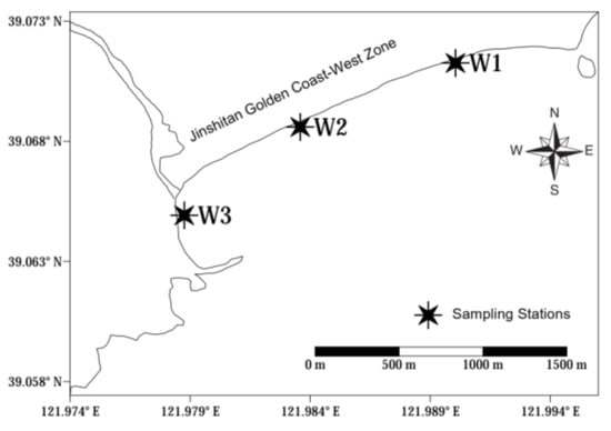 Jinshitan bathing beach is located in the North Yellow Sea of China, the largest and only natural light bath in northern China, and attracts nearly 30,000 to 100,000 visitors each day during peak tourist season. This beach is separate from the city of Dalian and easily impacted by typhoons. On 20 August 2018, typhoon “Wombia” of the international number 1818 passed through Dalian (CMA 25 m/s), accompanied by torrential rains (rainfall ranged from 100 to 250 mm). The survey started immediately after the typhoon (21 August 2018) and lasted nearly one month (15 September 2018). Samples were collected on 11 August as a reference before the typhoon.