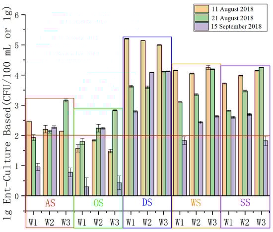 The concentration distribution of enterococci during the typhoon event, in which DS represents dry sand; WS represents wet sand; SS represents submerged sand; AS represents alongshore seawater; OS represents offshore seawater.